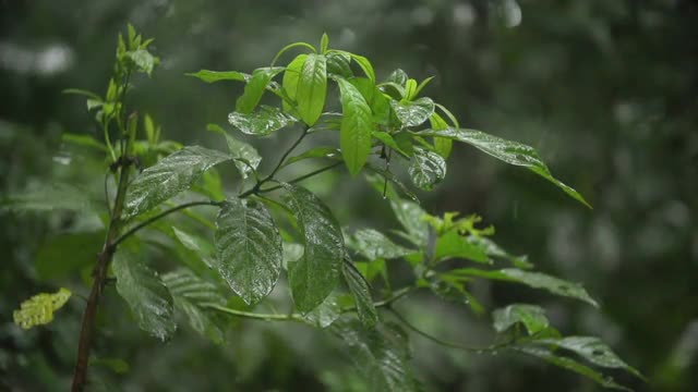 > CU Rain pouring from thatched roof of hut