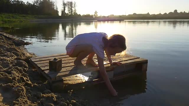 Young girl playing by river