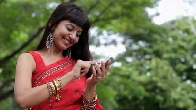 MS LA Young woman wearing sari, text messaging on mobile phone in park