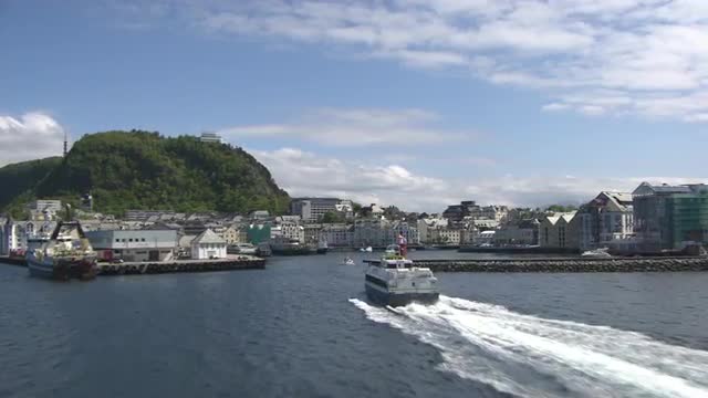 Aerial footage of Ålesund. A fishing village on the west coast of Norway.