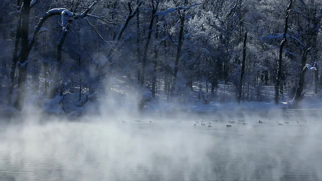 1095074 - Heavy snow falling on pond with 2 wood ducks swimming