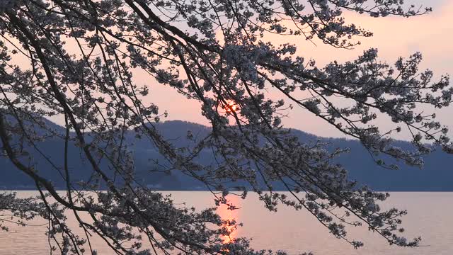 781428 - Cherry blossoms in full bloom at sunrise at lake Biwa, Shiga Prefecture, Japan
