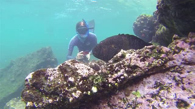 Giant Hawkfish poses for a perfect photo for a diver on Rabida Island in the Galapagos National Park, Ecuador.