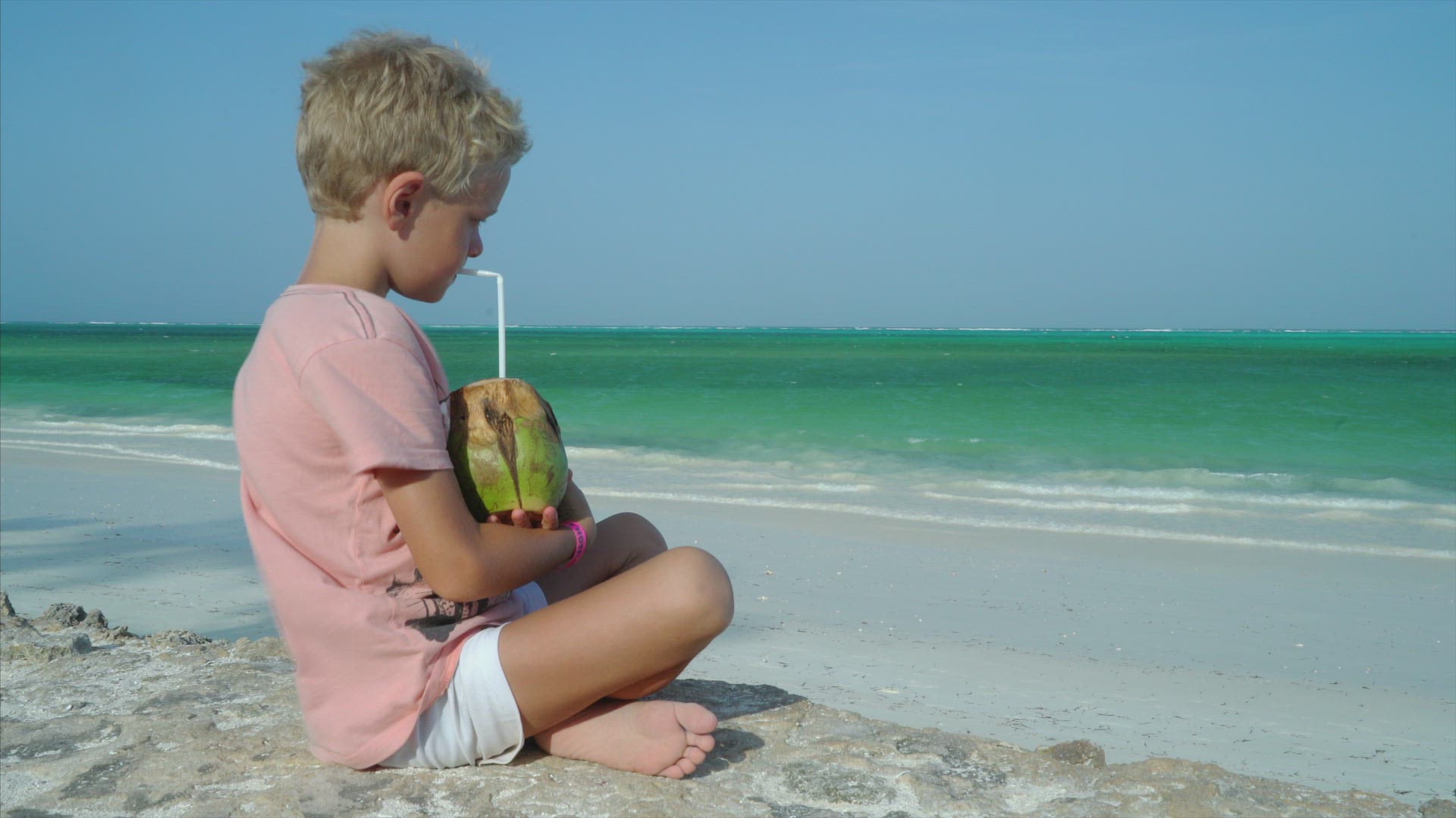 boy, six years old, sitting at beach drinking water from a coconut