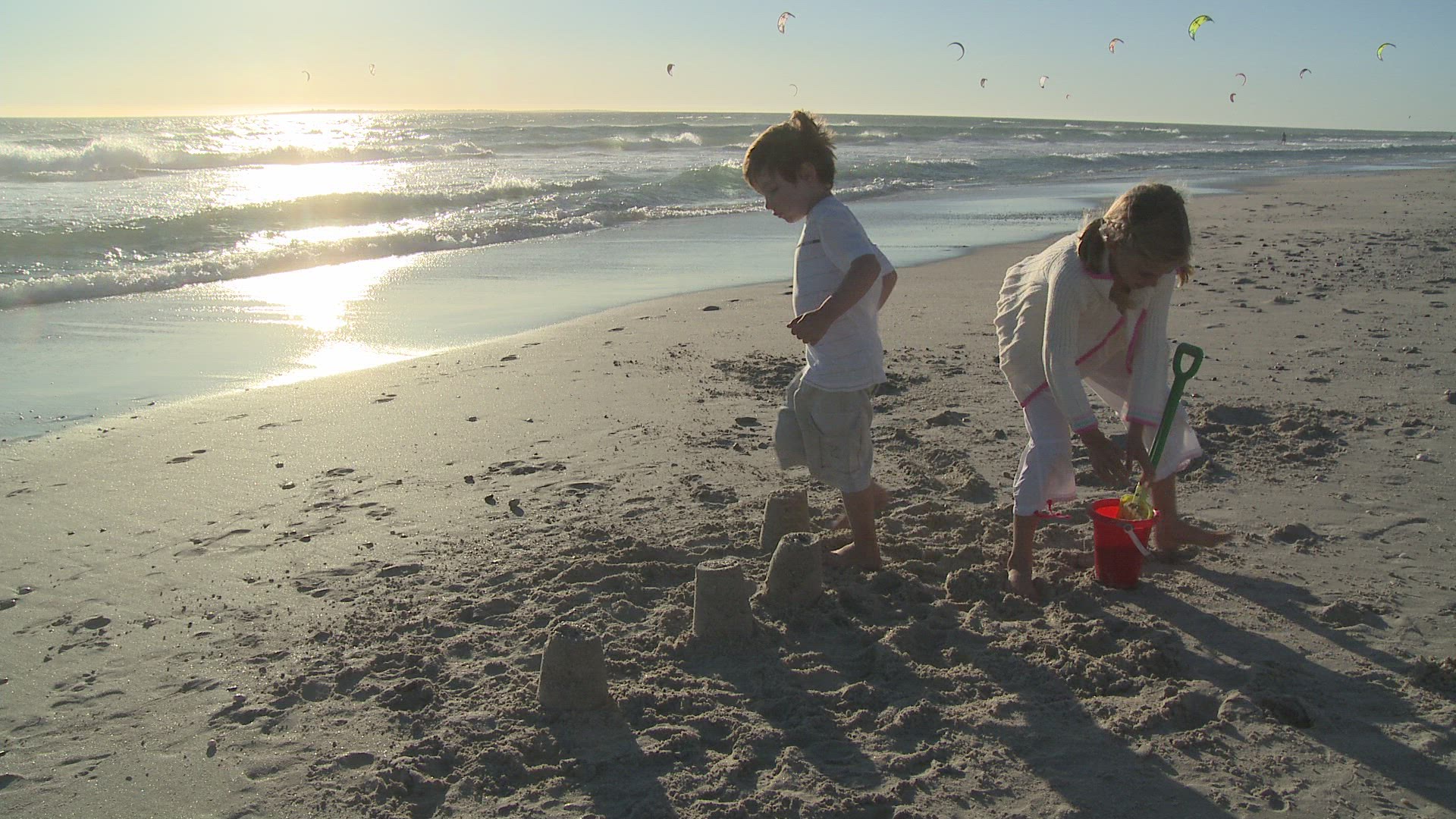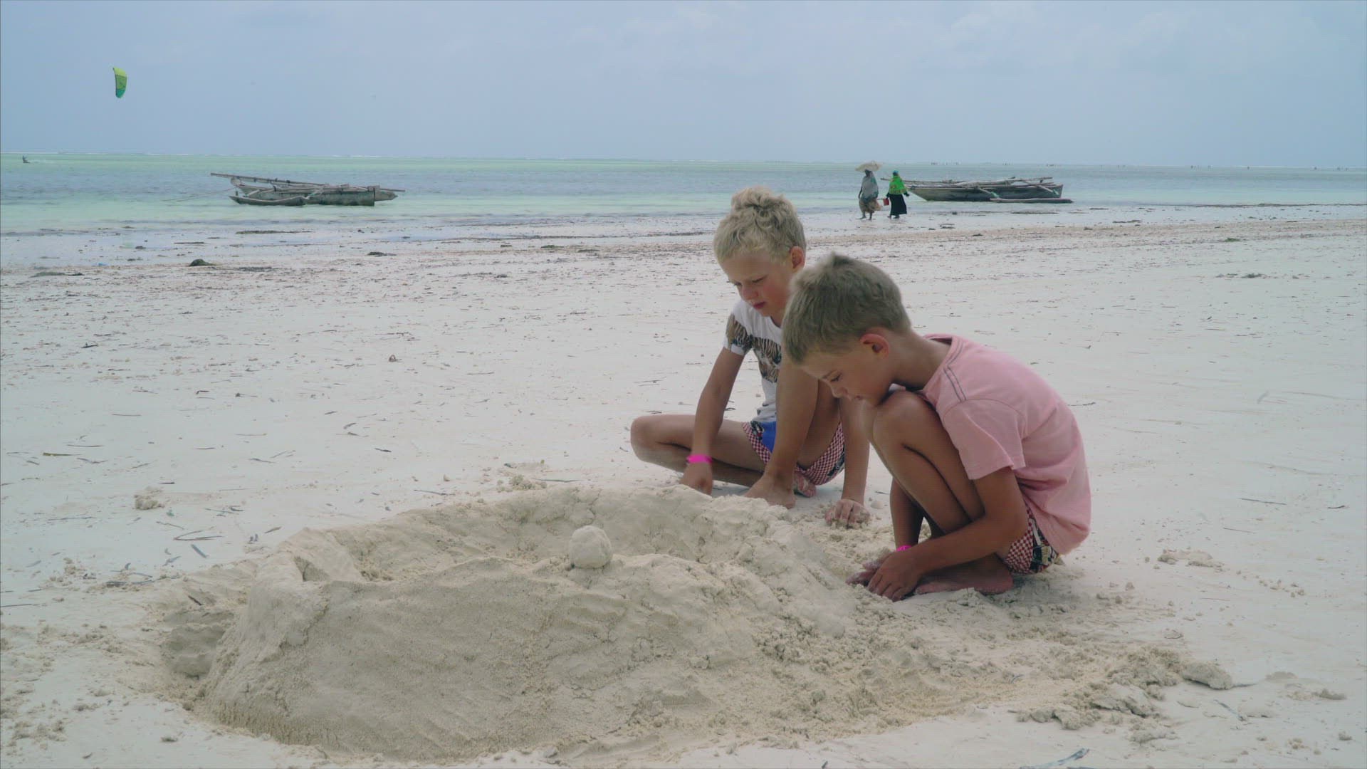 two boys, six years old, building a sand castle at a beach on Zanzibar