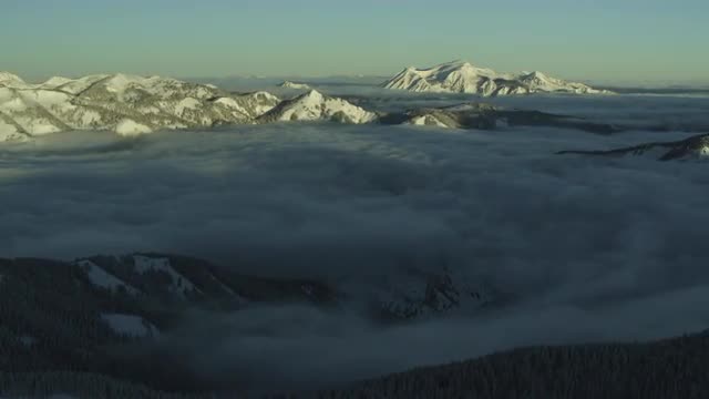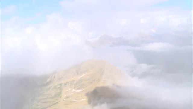 Aerial zoom of mountain peak inside a bed of clouds.