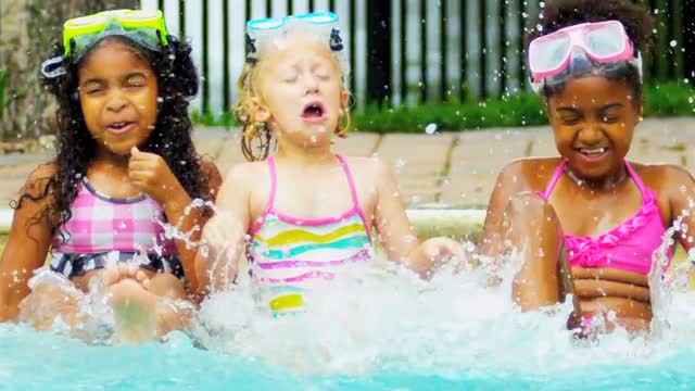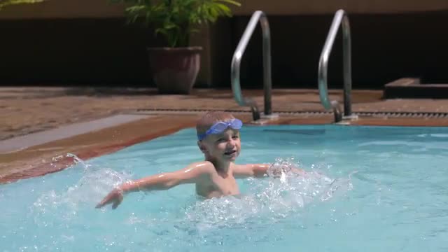 > two boys playing and splashing water in pool
