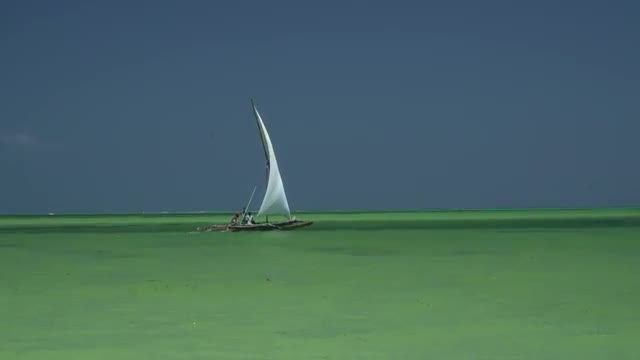 dhow sailing vessle sailing Close to beach on Zanzibar