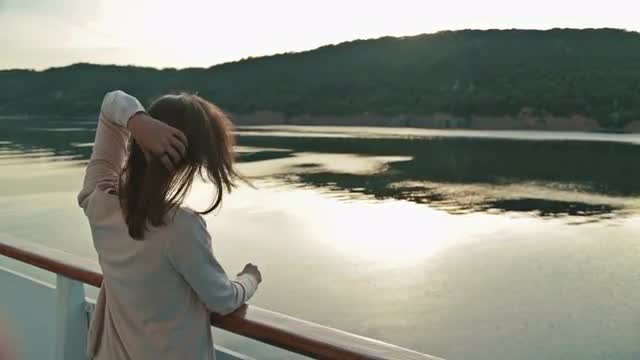 Portrait of young beautiful woman standing on deck of cruise ship, smiling and looking forward. Sunset light, golden hour. Strong wind waving her hair. Close up shot of woman's face