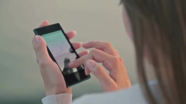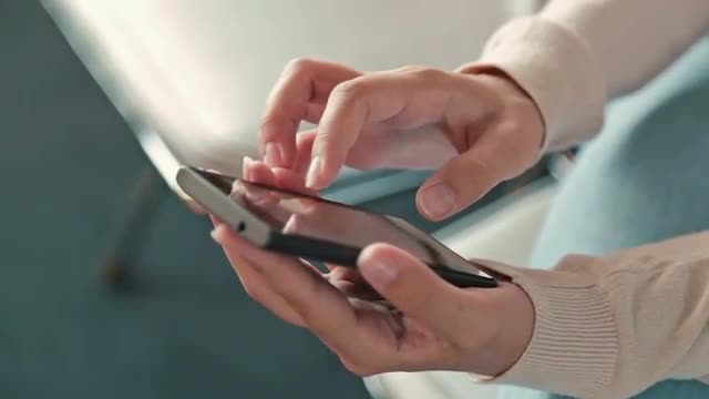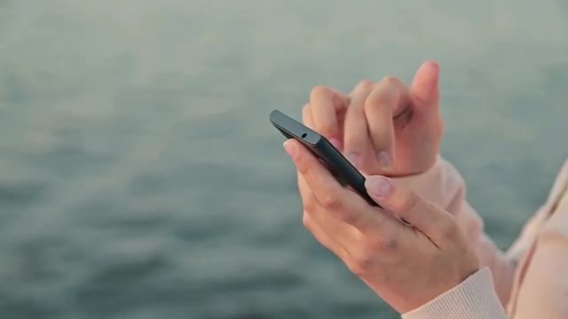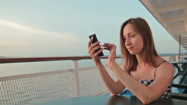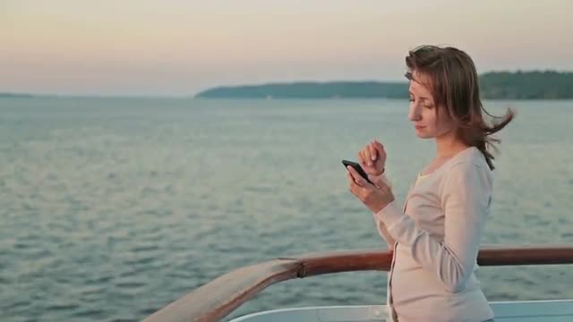 Young beautiful woman using smart phone on deck of cruise ship. Sunset light, golden hour. Wind waving her hair. The river and riverside can be seen in the background behind her.