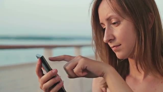 Young beautiful woman using smart phone on deck of cruise ship. Sunset light, golden hour. Wind waving her hair. The river and riverside can be seen in the background behind her.