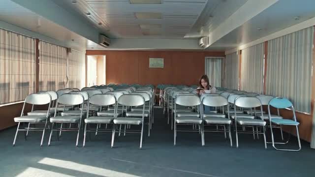 Pretty caucasian woman using the smart phone with various hand gestures (scrolling, touching, typing) in the empty conference hall of cruise ship.