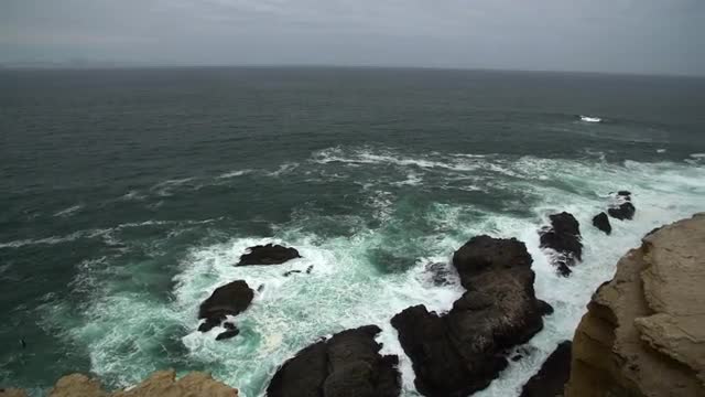Big Ocean Waves Breaking on Cliff Rock, stormy weather, long right pan