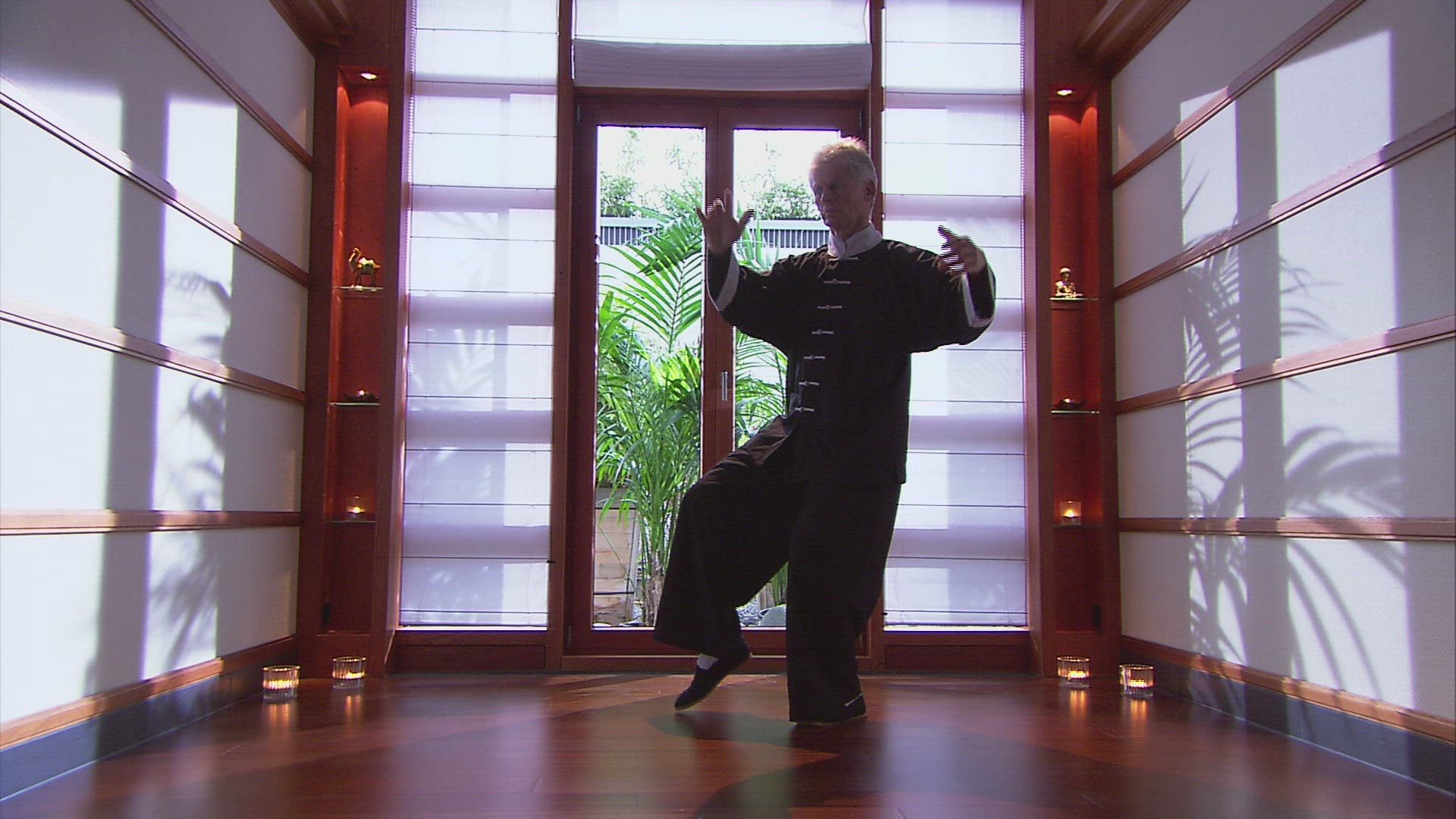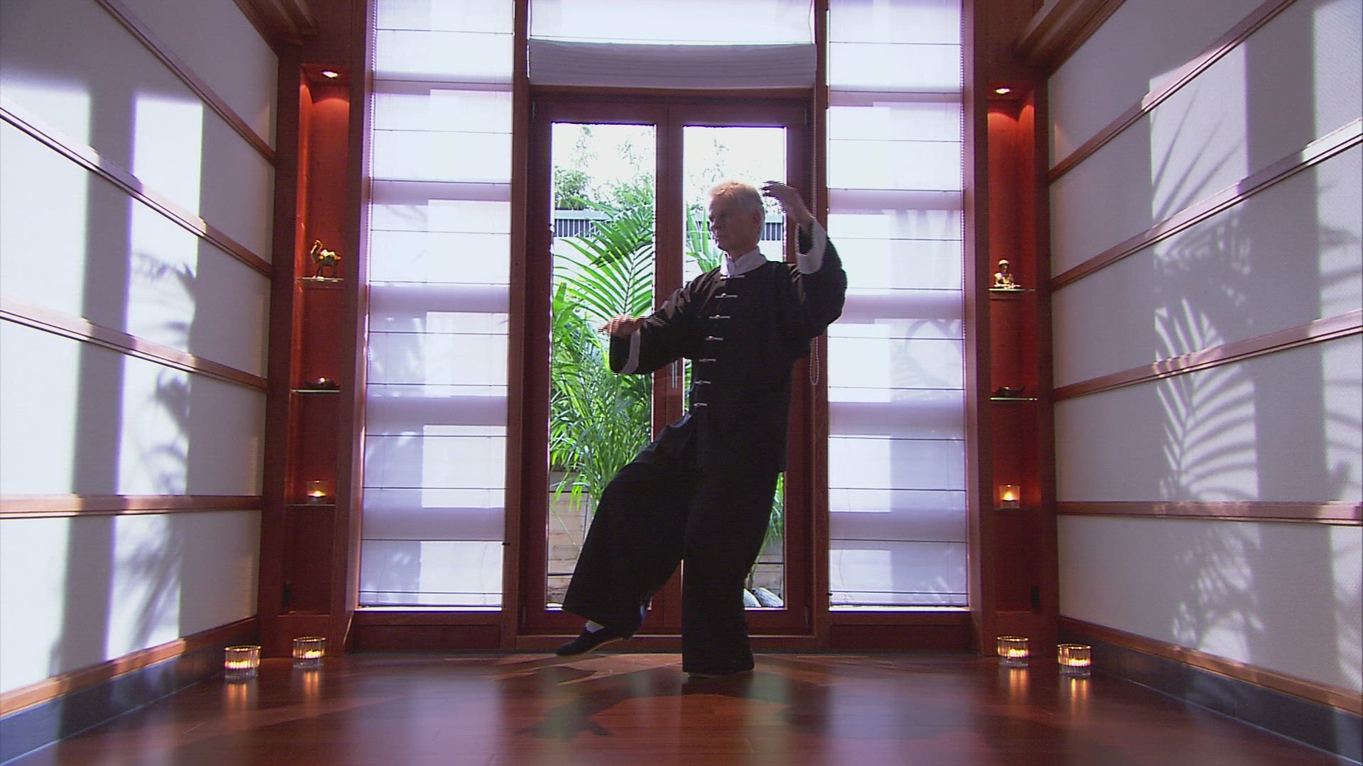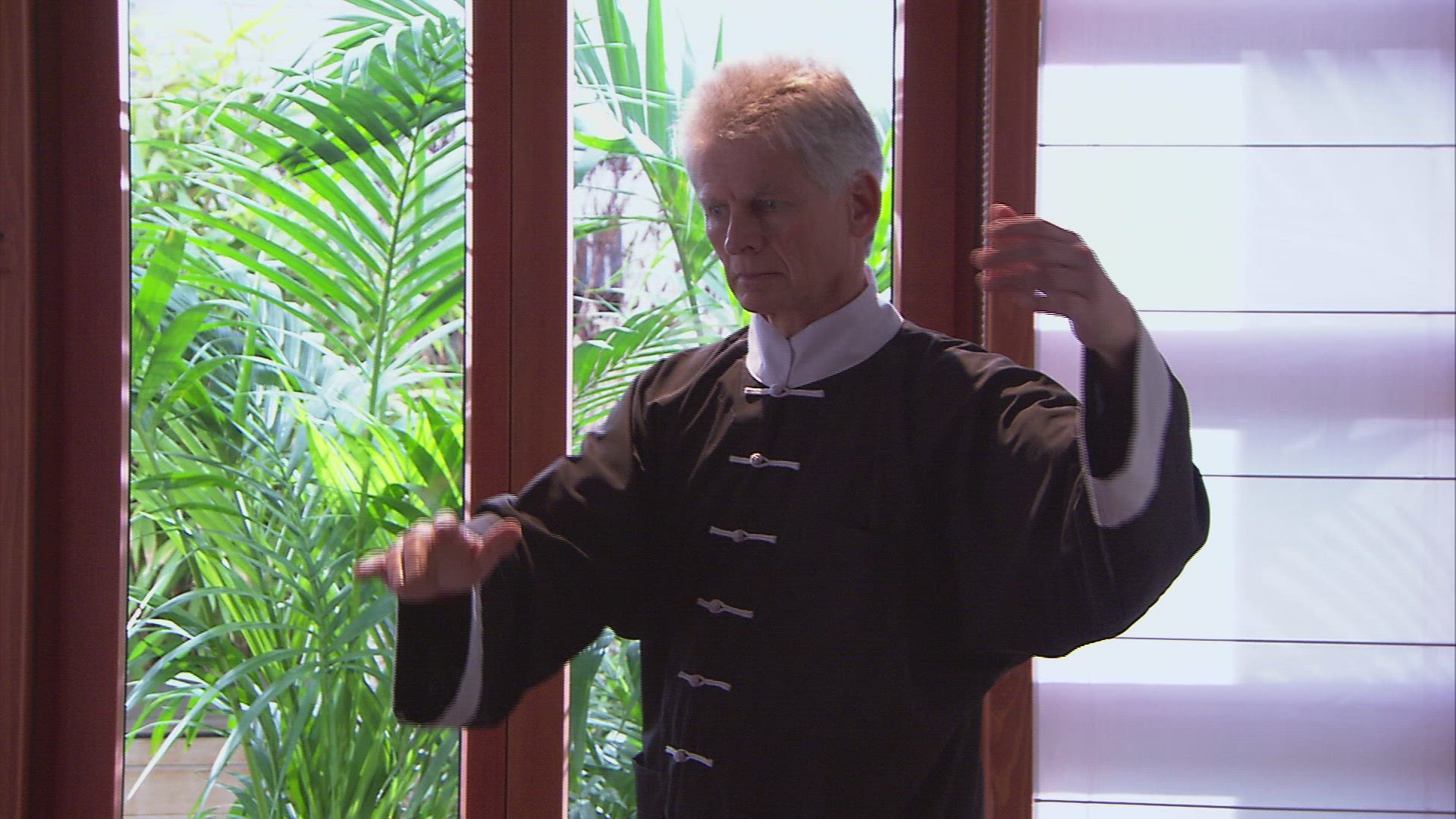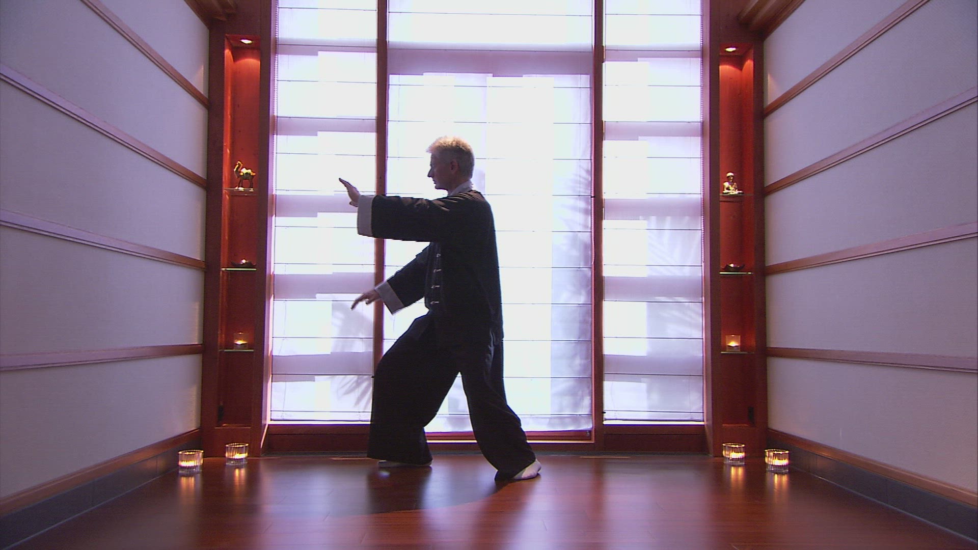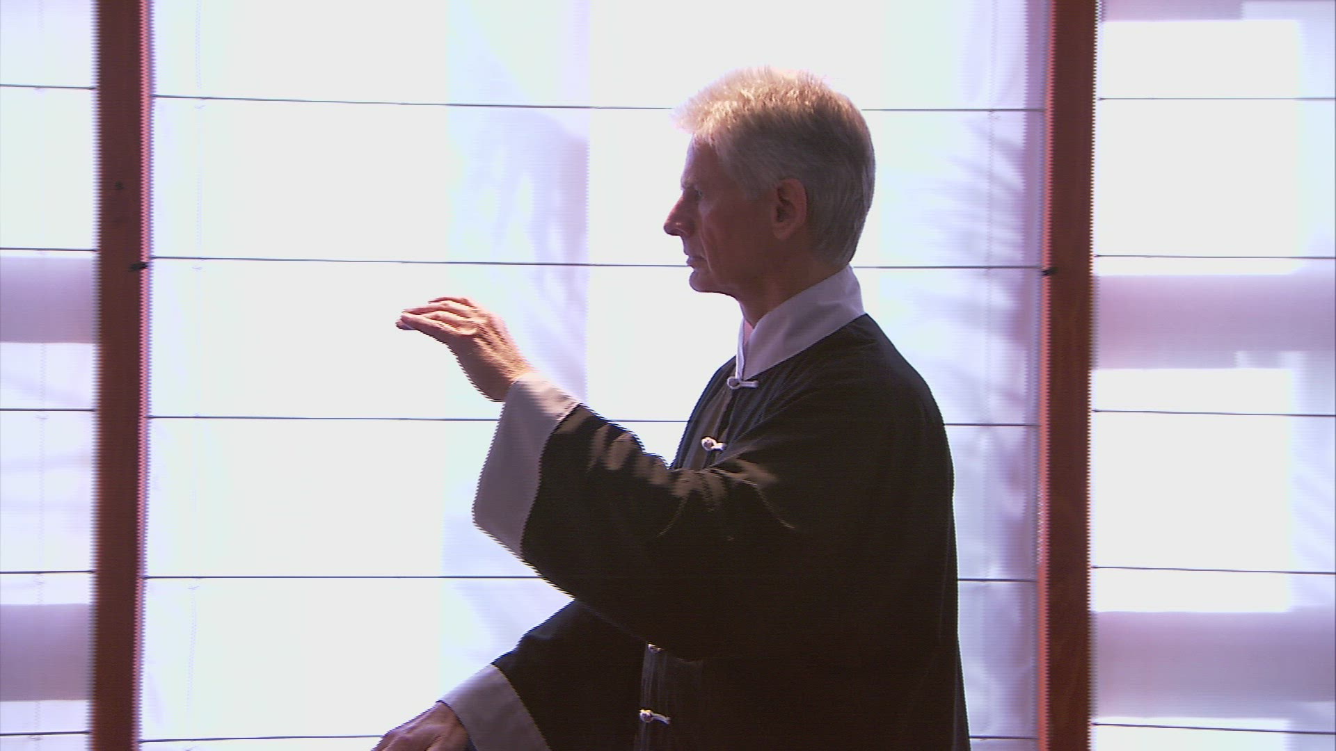 Monk master is practicing performs tai chi moves on the rocks in front of the ocean