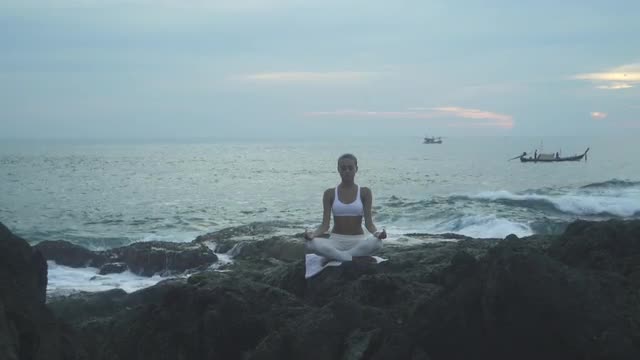 Exercises calmness and harmony, girl is making yoga pose on beach, happy woman relaxation