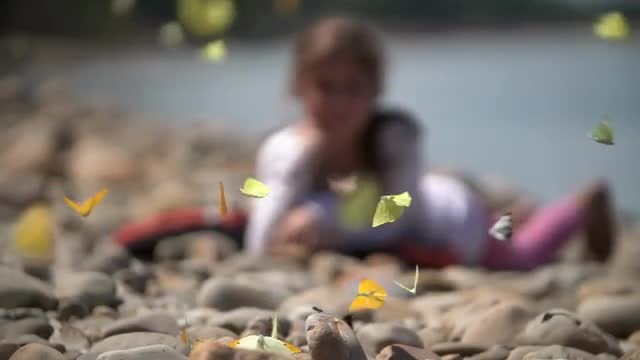 > Turtle crawls into water, butterflies present, high speed
