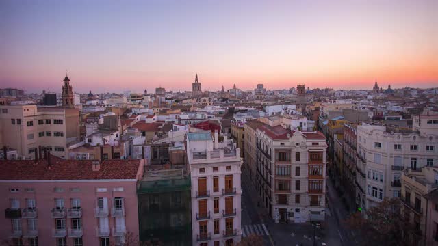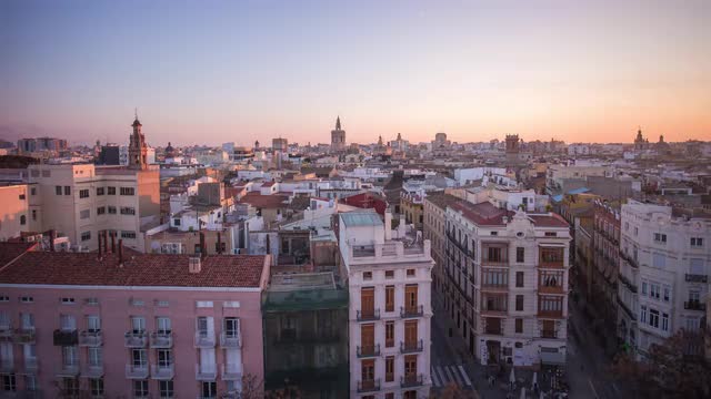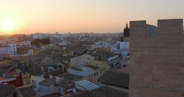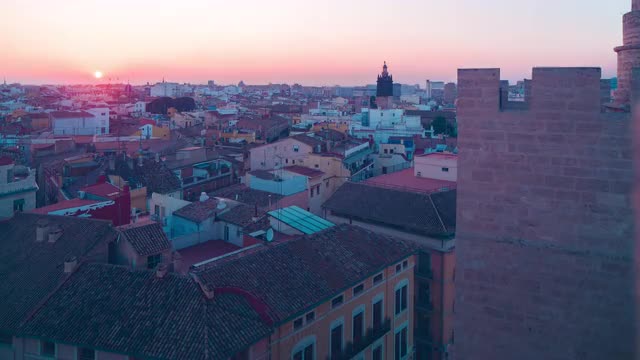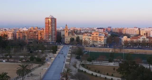 Aerial cityscape of Valencia at sunset, Spain. City panorama with houses, transport traffic and green parks with sports grounds
