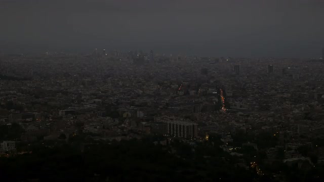 Aerial shot of night Barcelona with city lights and illuminated Torre Agbar skyscraper, Spain
