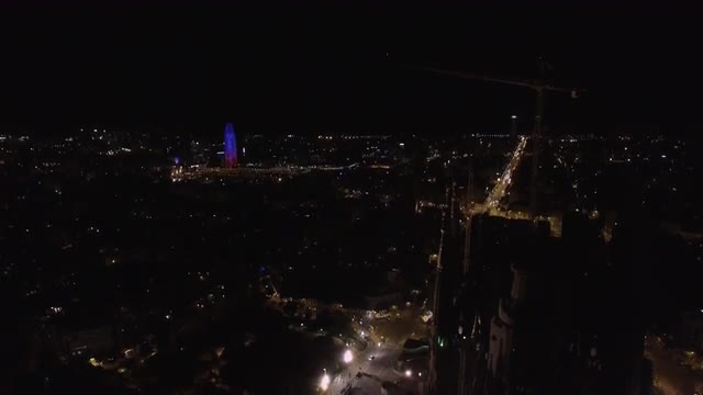 Aerial view of Barcelona at night. Cityscape with Sagrada Familia and illuminated Torre Agbar skyscraper