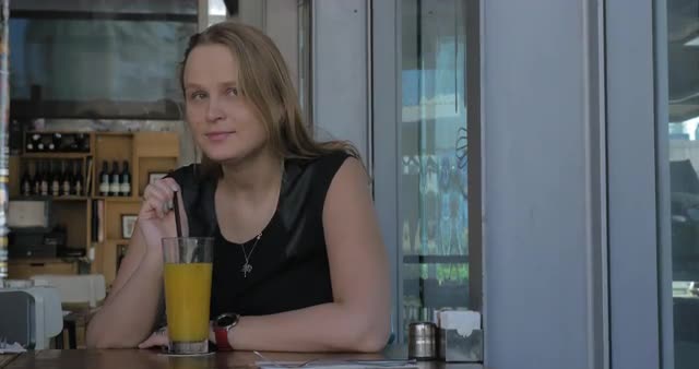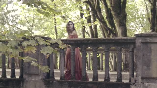 Young Woman With Dark Brown Hair Stops After Walking and Looks Somewhere Straight Far Away. Her Middle-Length Hair Floats in the Air.light Smile on Her Face.green Eyes Full of Love and Expectation. Nature is in Green Colors,it's Summer Time. Her Eyes Are Moving. She is in State of Happiness Waiting For Her Lover to Come to Her. Light Make-Up on Her Face Makes Her Look More Natural.sophisticated Woman With a Great Dream in Her Eyes.