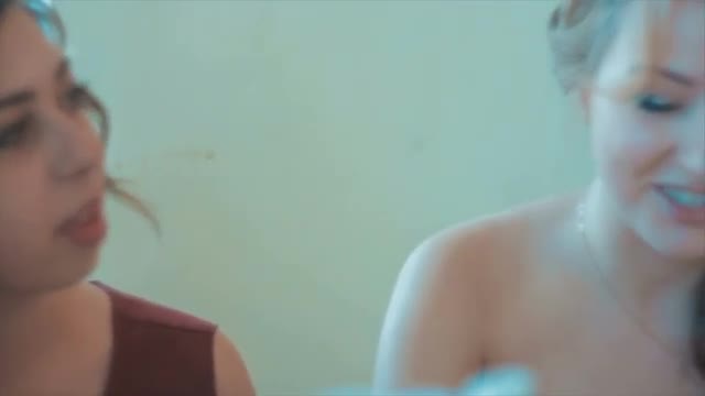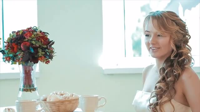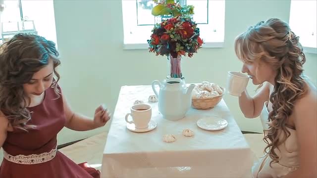 739113 - Bride Sits Down to Drink Hot Tea With Her Friend Slow Motion