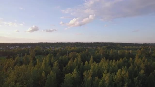 Flying over the woods, village and railway running through it. Scene at sunset, Russia