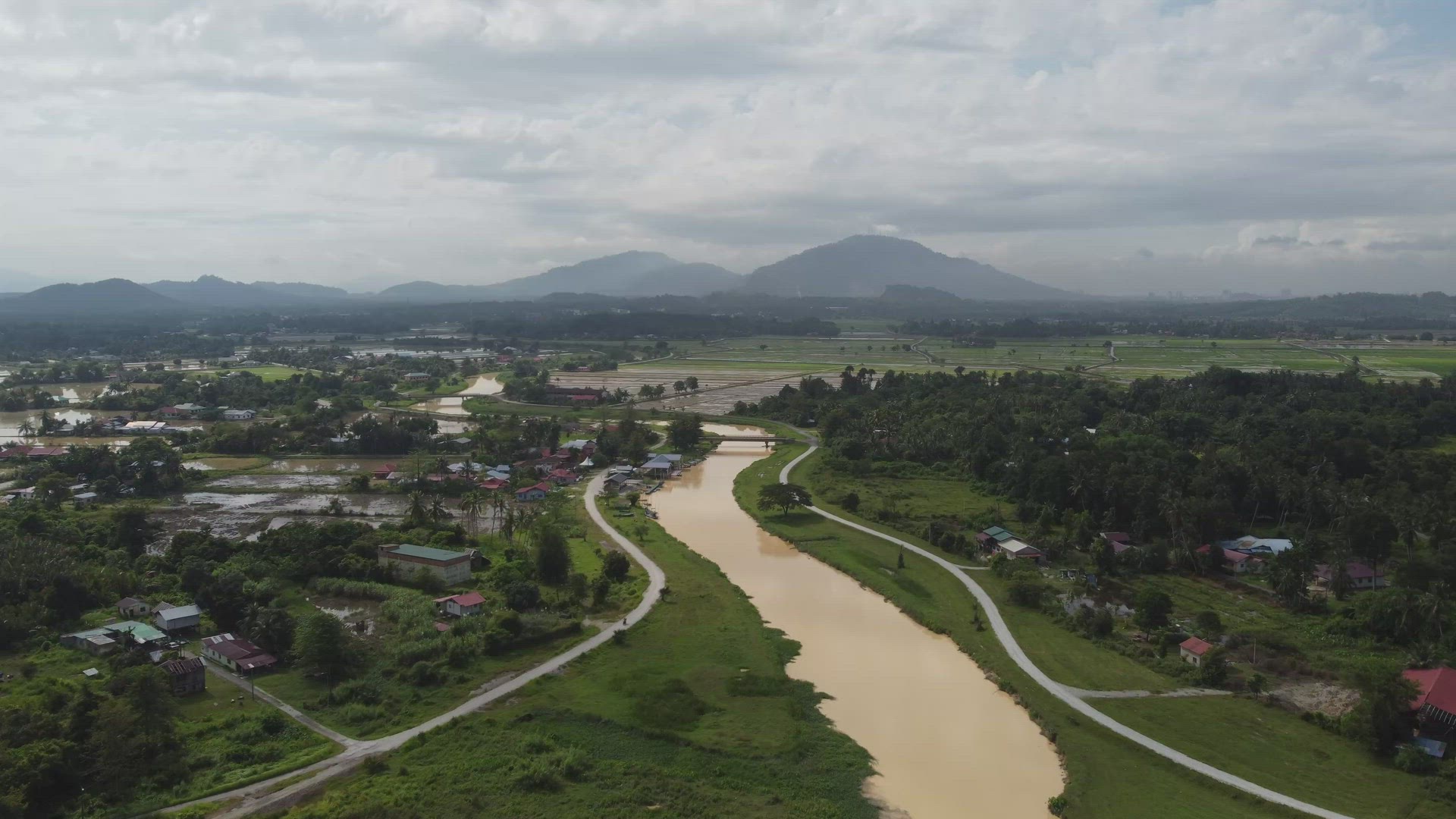 Aerial rural scene. View with village, vast green fields and woods. Russian countryside
