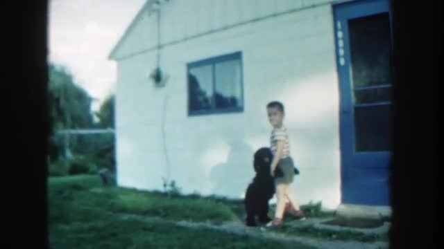 > 1953: black pet dog playing and enjoying on green grass garden CALIFORNIA