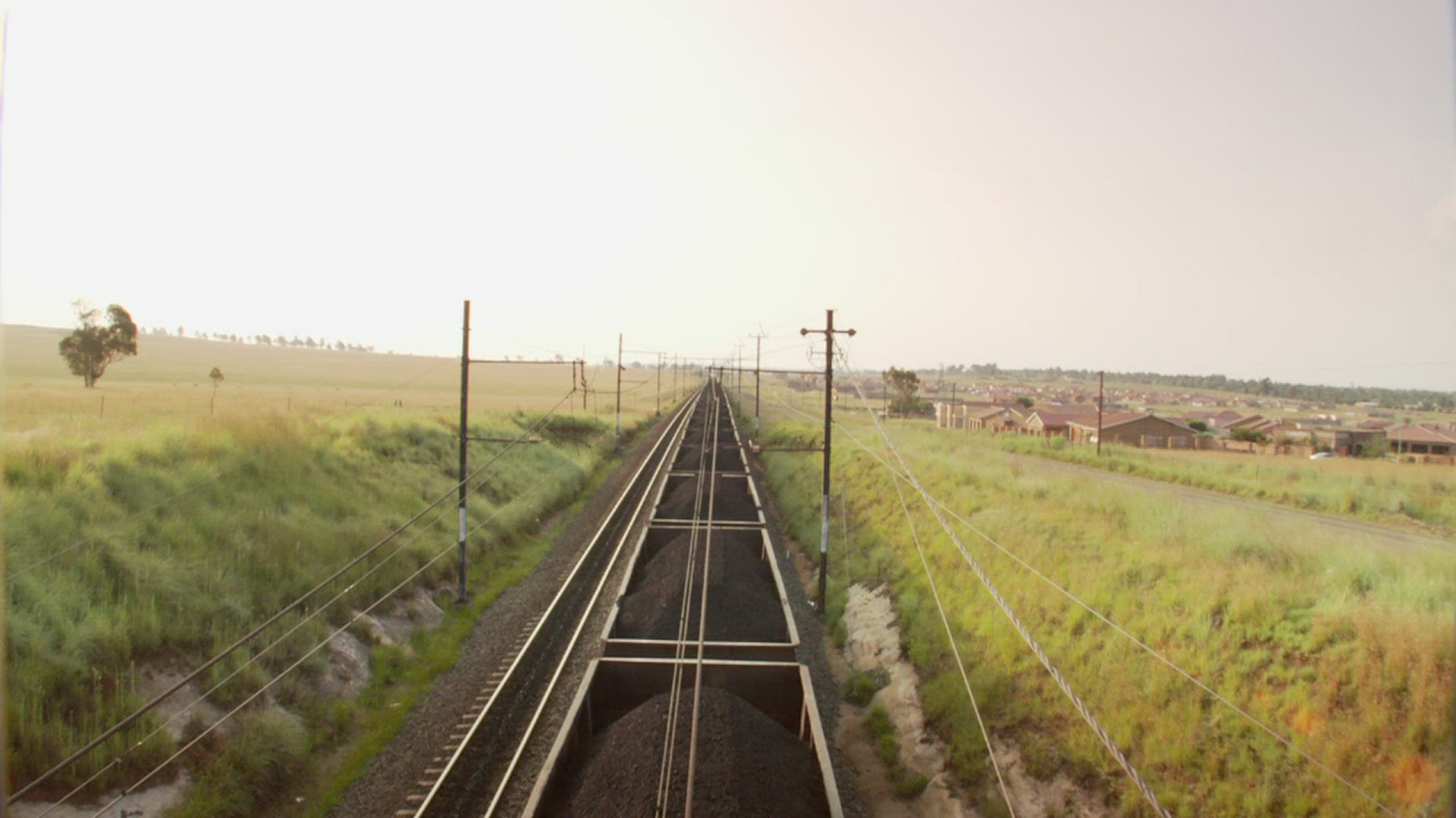 > Flying over village houses and moving cargo train