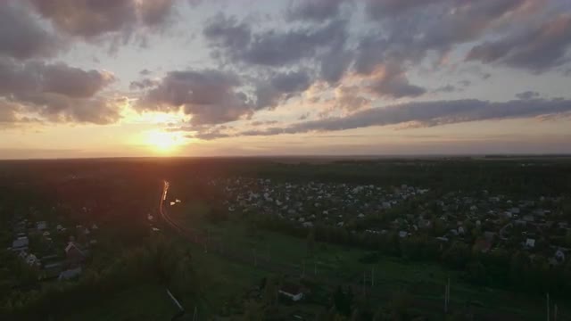 Aerial shot of Russian village and freight train traveling through it, Russia