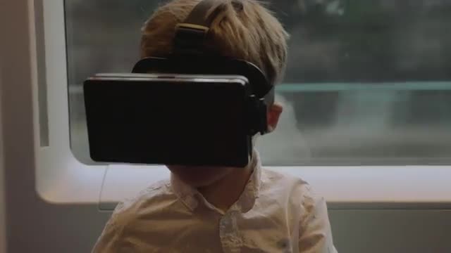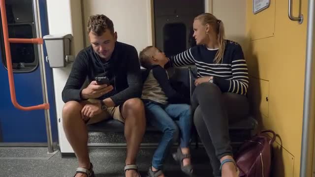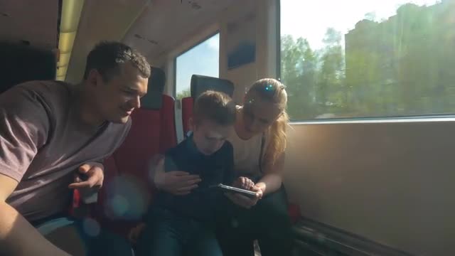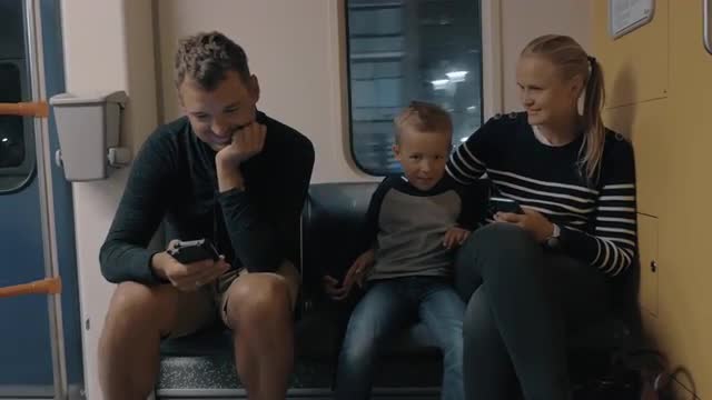 Family of three in subway train. Dad using cellphone and showing something to his wife and son