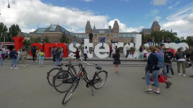 AMSTERDAM, NETHERLANDS - AUGUST 09, 2016: Popular tourist attraction Amsterdam slogan in front of Rijksmuseum in bright sunlight