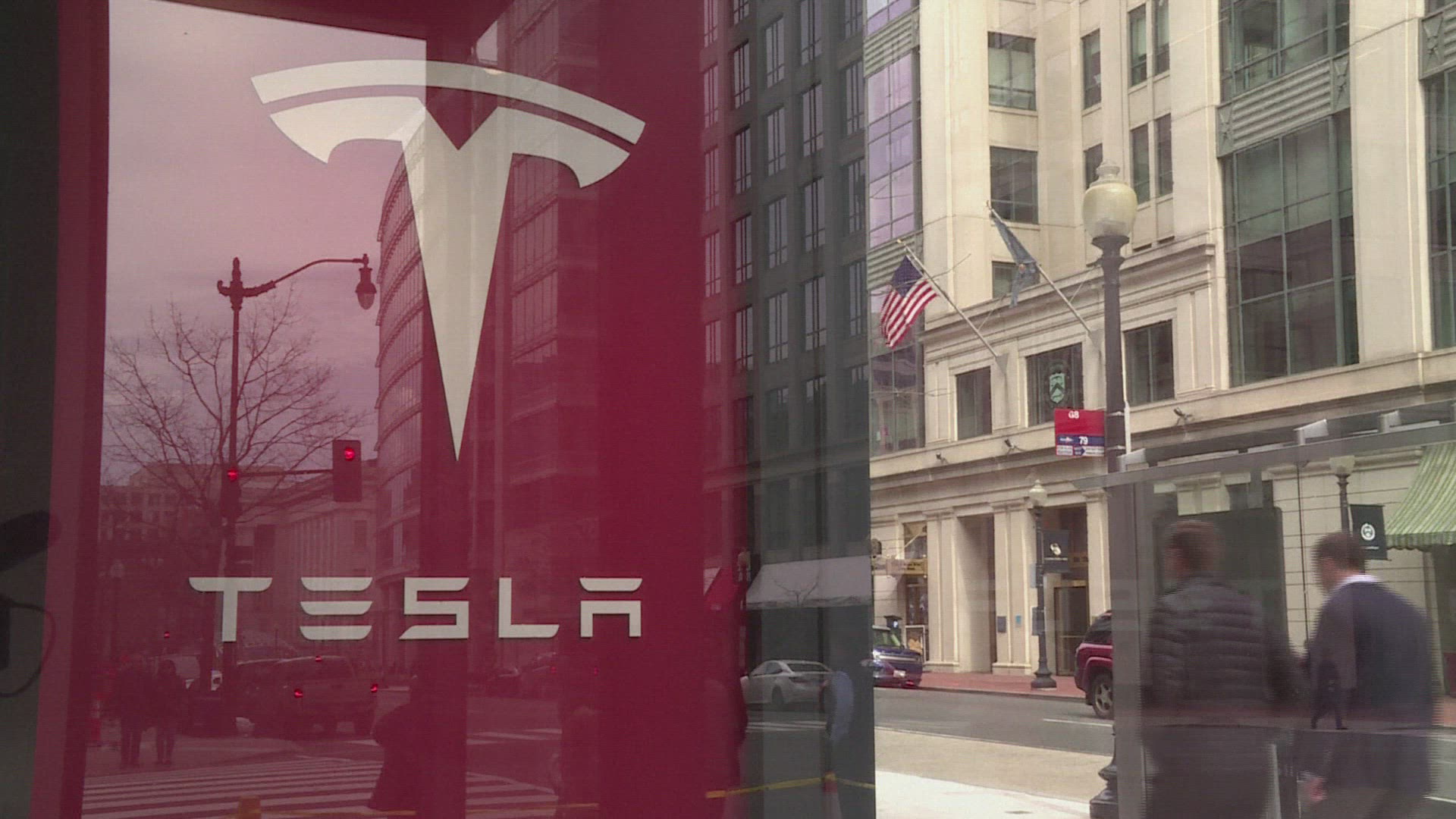 AMSTERDAM, NETHERLANDS - AUGUST 09, 2016: View to the city street and Tesla Store at the corner. Car exhibited in show-window. American automaker specializing in electric cars founded in 2003