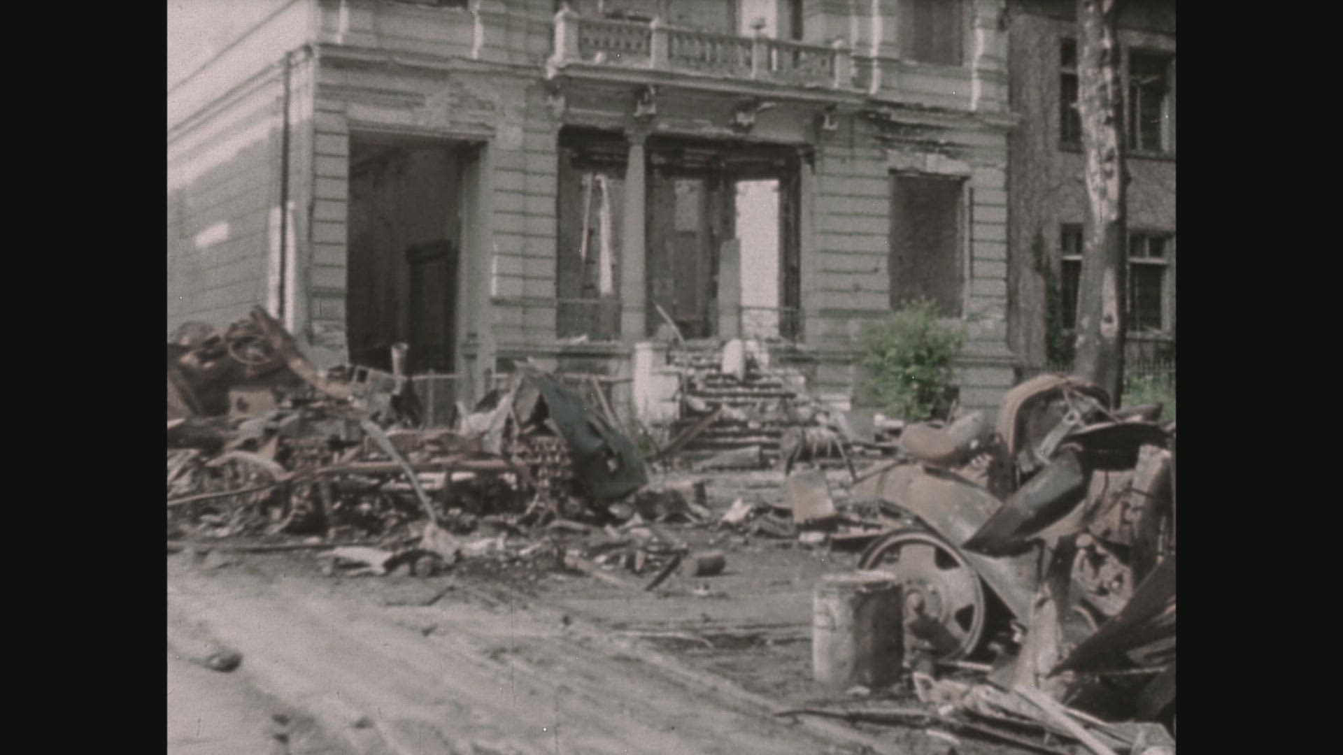 > 1944: people are walking and driving truck and behind there is wrecked building MANILLA PHILIPPINES