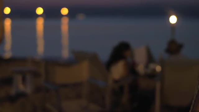 Defocused shot of beach cafe in the evening with couple relaxing near the quiet sea