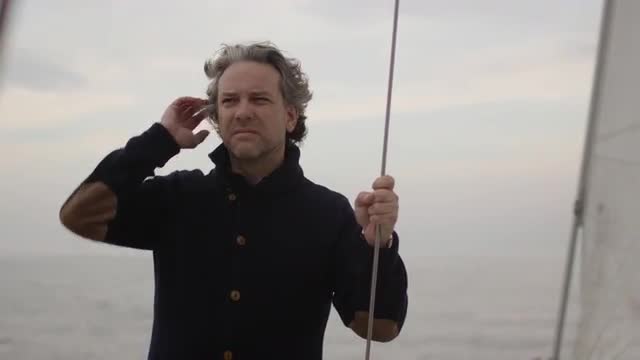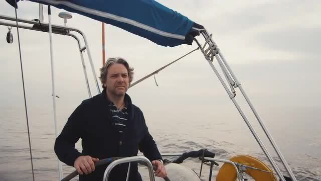 Close-up shot of laughing long-haired senior man on sea and evening sky background