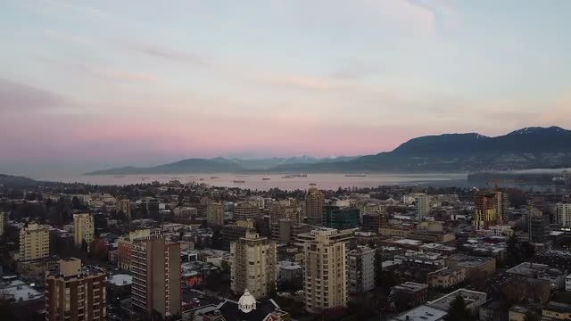1127745 - Aerial view of houses in Vancouver with mountains and cargo ship during sunset