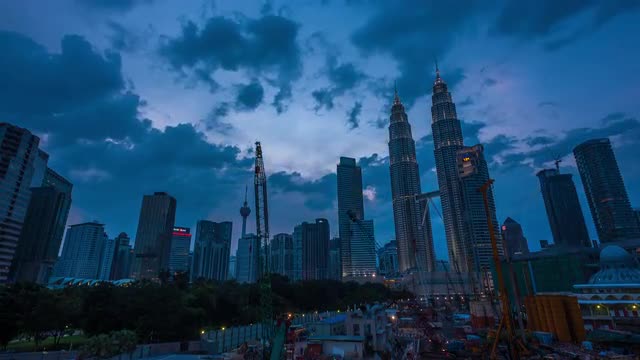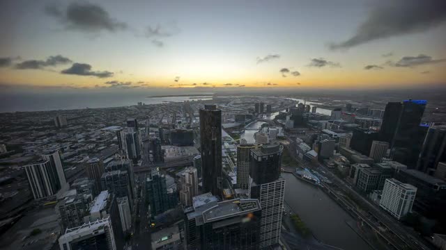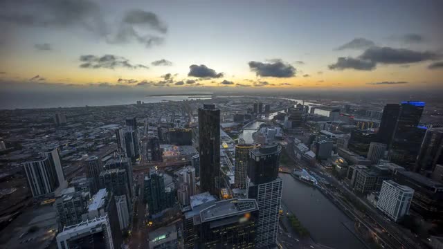 Sunset, night scene, sunrise, and cloudscape at Melbourne city skyline. Aerial view