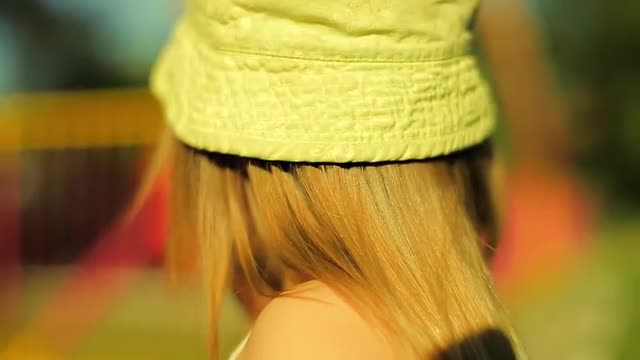 View From the Back Adorable Girl With Blond Hair in a Green Hat Looking at Swinging Carousel Then Tu