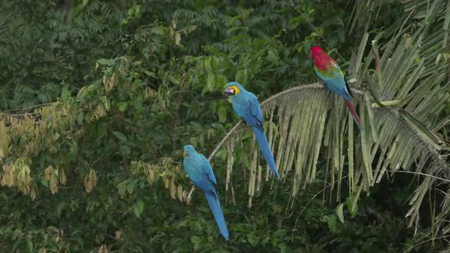 > Flock of Blue Macaws Perched on Leafless Treetop
