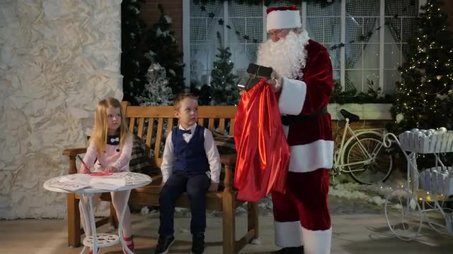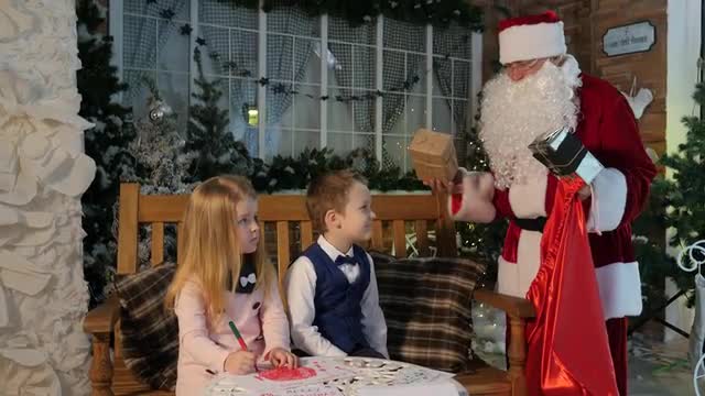 the Boy With a Mother Sitting Near Christmas Tree Reading a Book. Camera Movement From the Christmas Tree and Santa Claus Toy to the Boy With the Book.