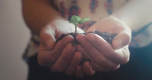 Shooting Close-Up of Hands of Female With Bright Orange Nail Polish That Tremblingly Holds Small Green Seedling With Leaves. Concept of Wildlife and Plants, Beautiful World Around us and Natural Wonders, Beginning of Life or Emergence of New Life.