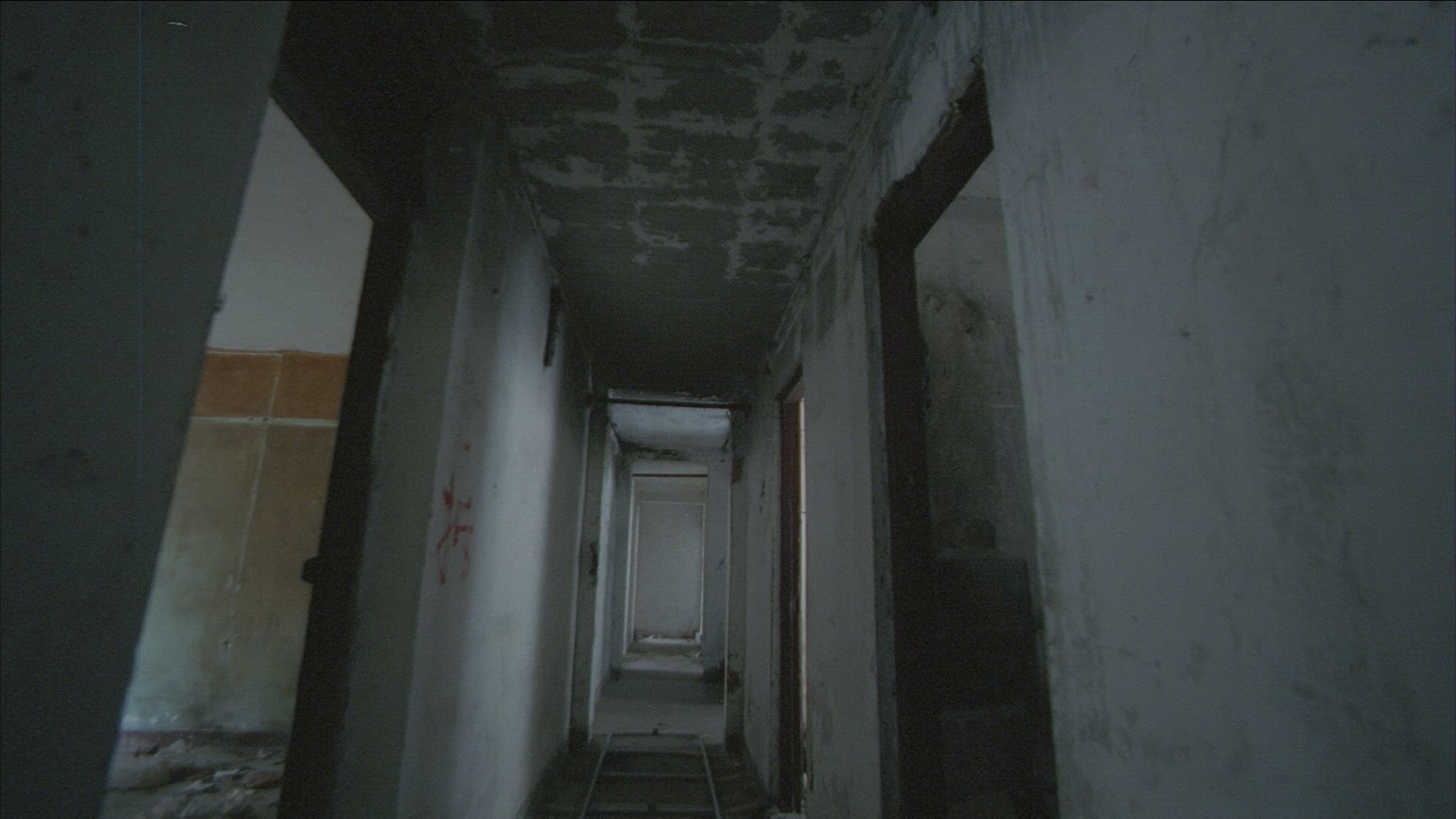 > Aerial drone scene of abandoned, destructed town. Demolished, old, rubbled houses. Camera registers