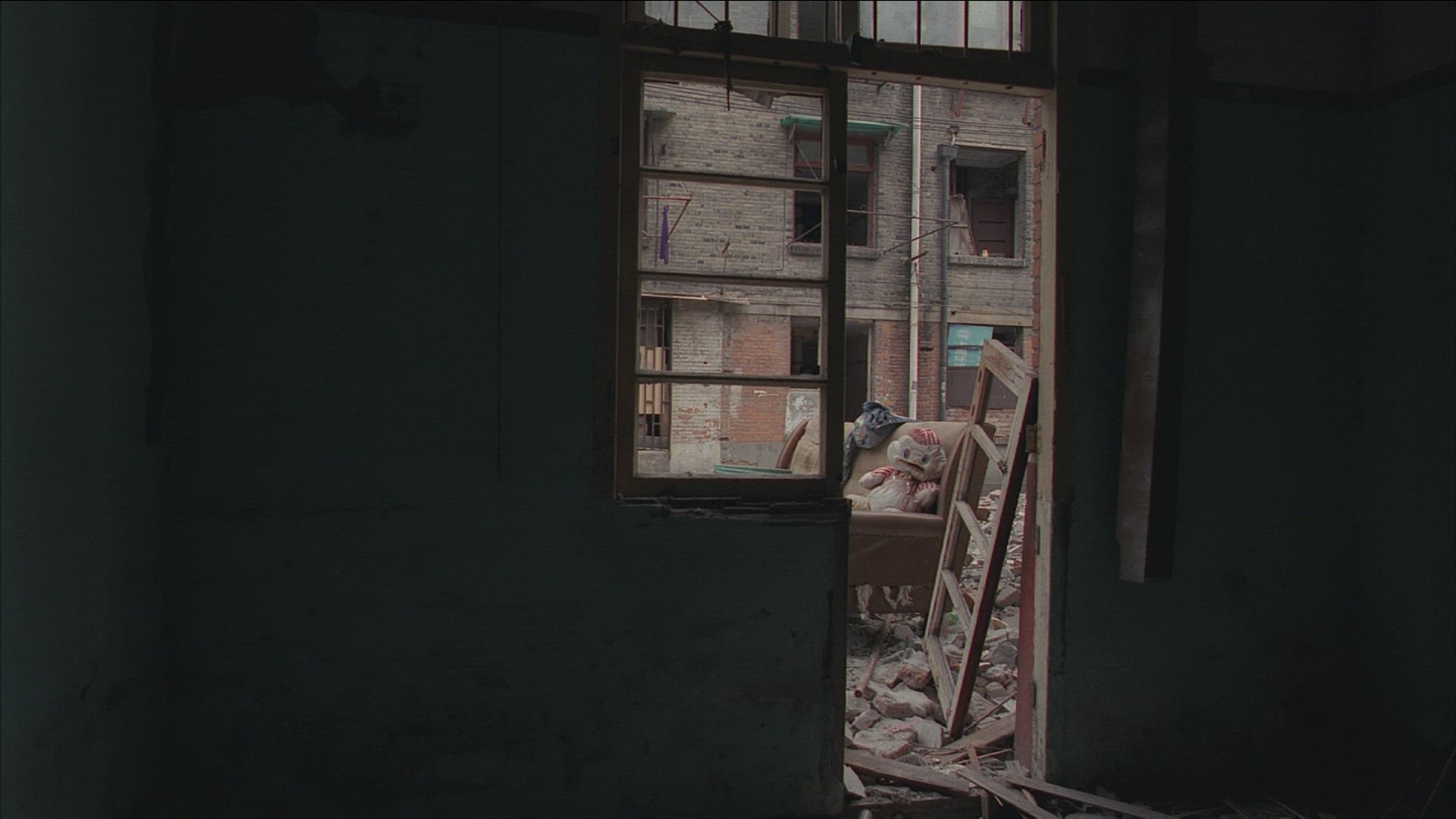Aerial drone scene of abandoned, destructed town. Demolished, old, rubbled houses. Camera registers neighbourhood, slowly moves laterally. People walking on the solitary streets. Sad cityscape.