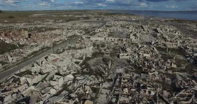 Aerial drone scene, destroyed city, catastrophe. Flying from low altitude to panoramic view.