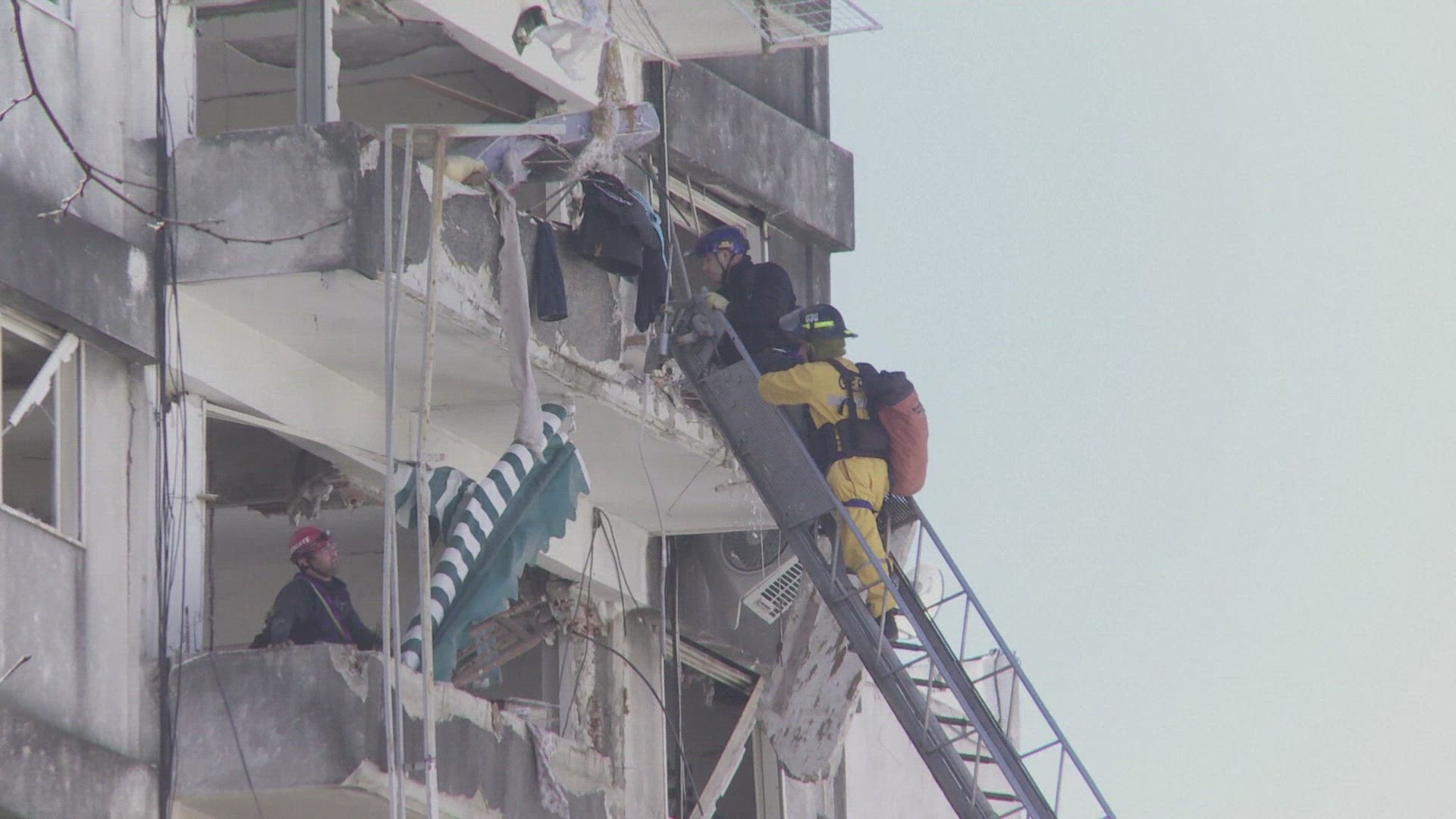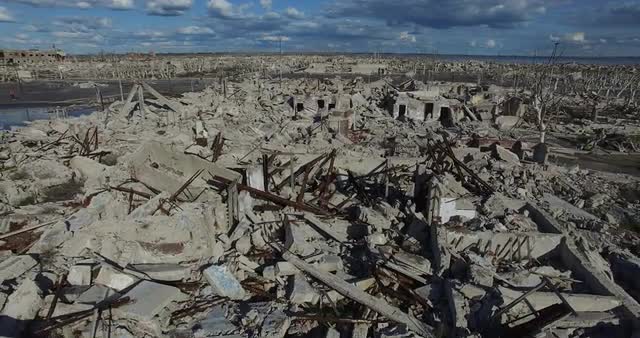 Aerial drone scene of destroyed city by natural catastrophe. Camera flys through the demolished city