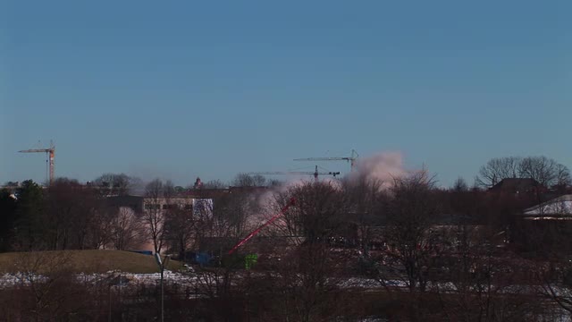 > Aerial drone scene of destroyed city by natural catastrophe. Camera flys through the demolished city