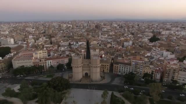Aerial shot of Valencia with view to Serranos Towers, historical landmark of the city. Gate built in Valencian Gothic style between 1392 and 1398, Spain