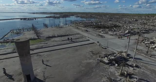 Aerial drone scene of destroyed city by natural catastrophe. Camera flys through the demolished city