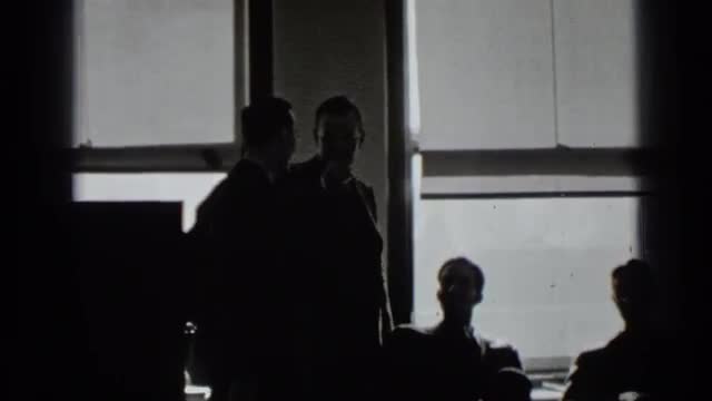 > 1939: room with office workers conversing woman walks past some persons sitting some standing NEW YO